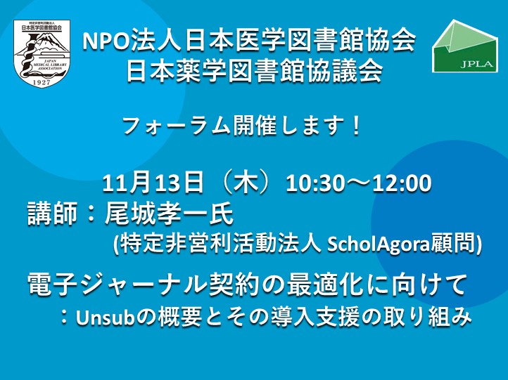 このような状況を踏まえ、本フォーラムでは購読の最適化を支援する代表的な製品である『Unsub』の仕組みや導入事例を通じて、これまでの取り組みと成果について学び、今後の医歯薬系の図書館の収集活動を考察したいと思います。