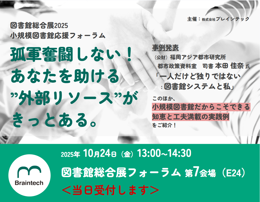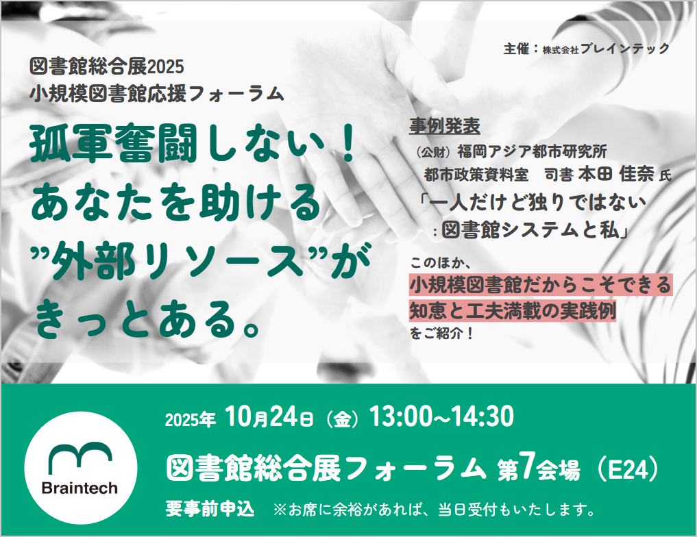 前半では、事例発表としてワンパーソンライブラリーの専門図書館で働く本田様から、着任してすぐの引っ越しから現在までのご経験をお話しいただきます。後半は、様々な館種の小規模図書館が集うブレインテックのユーザー会で、過去に紹介されてきた様々な小規模図書館の実践例から、知恵と工夫満載のTIPSを時間が許す限りご紹介します。