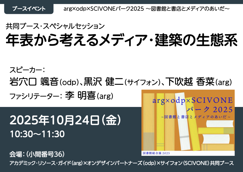 制作した年表をもとに、共同ブースメンバーが「図書館と書店とメディアのあいだ」について語り合います。会場に展示する年表は、来場者の皆さまも自由に書き加えることができます。あなたの視点や体験を、ぜひ年表に加えてください