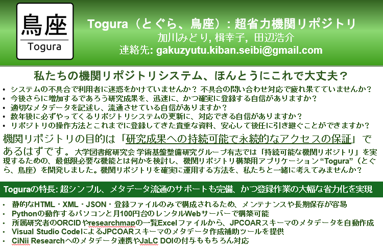 このような状況を打破するべく、大学図書館研究会 学術基盤整備研究グループでは有志により「持続可能な機関リポジトリ」を実現するための、最低限必要な機能とは何かを検討し、機関リポジトリ構築用アプリケーション “Togura”(とぐら、鳥座)を開発しました。 “Togura”(とぐら、鳥座)は、JAIRO CloudやDSpaceのようなサーバーとして動作するリポジトリソフトウェアではなく、静的HTMLファイルとメタデータファイルを出力するPythonスクリプトです。公開用のHTMLファイル、JPCOARスキーマのXML、JaLCのXMLファイルを一括で出力することができます。これらをWebサーバーにアップロードすることで機関リポジトリを構築することができます。公開ファイルは静的ファイルだけで構成されるため、Webサーバでのセキュリティの問題が発生する可能性は極めて低いと考えられます。また、動作がシンプルなので意図しない動作が起こる可能性も低いと考えられます。